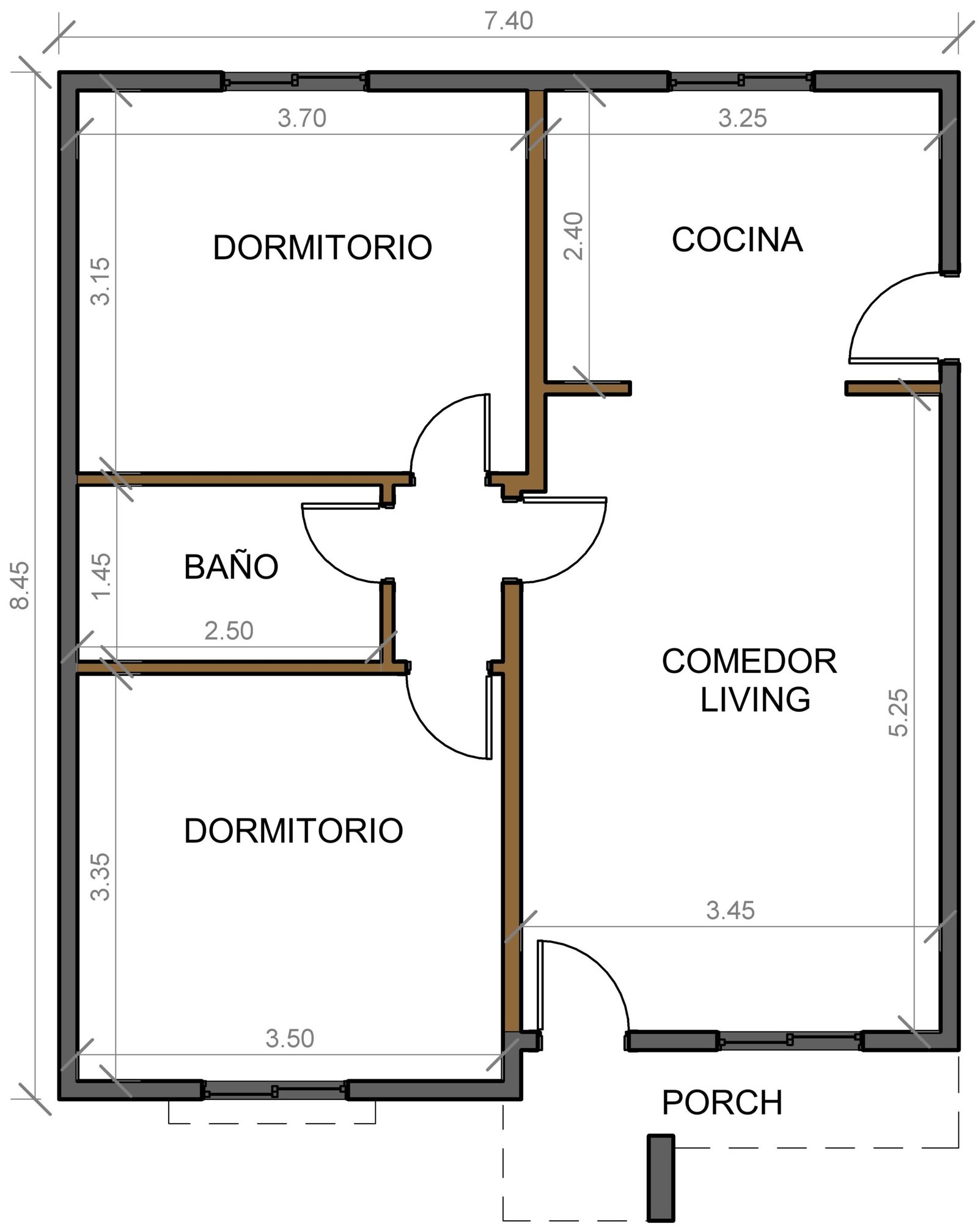 En el interior se colocan 4 puerta placa de cedrillo con marco de madera de 0.74m x 2.00m.