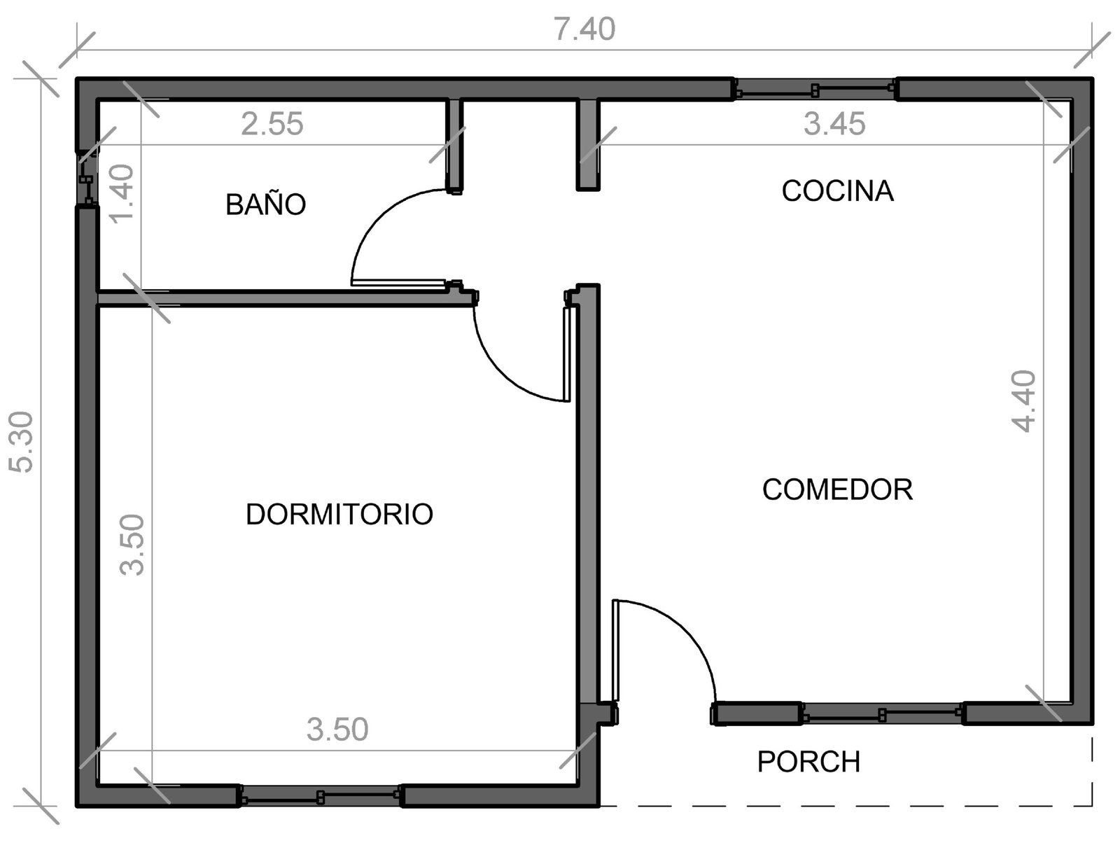 En el interior se colocan 4 puerta placa de cedrillo con marco de madera de 0.74m x 2.00m.